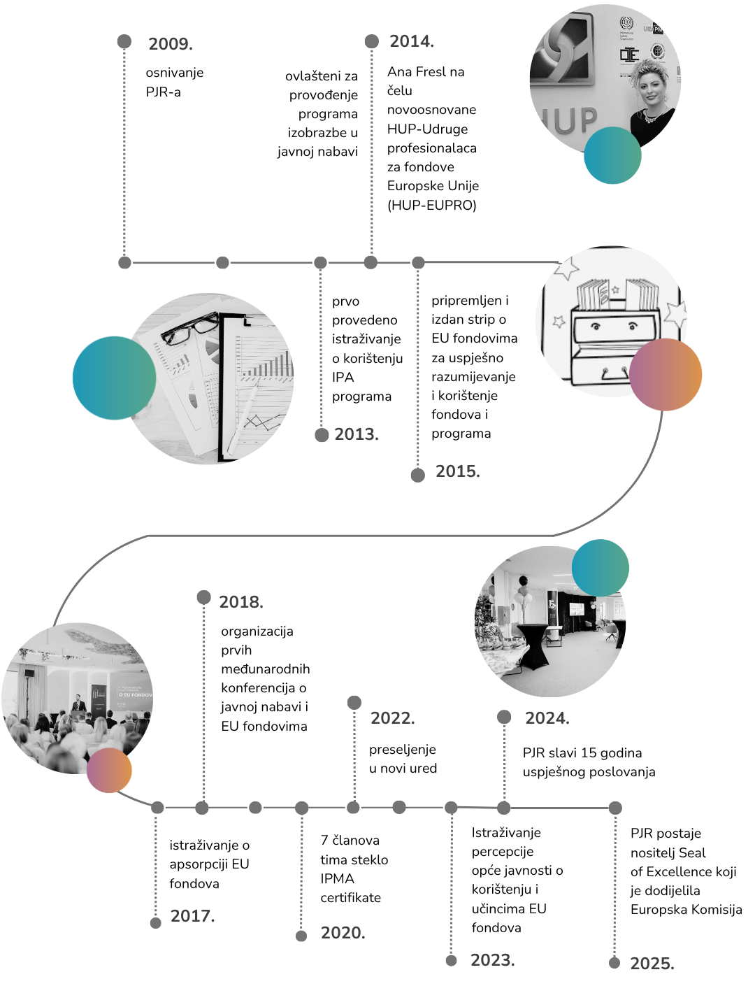 PJR čine ljudi s iscrpnim poznavanjem sustava i institucija EU fondova i javne nabave koji vam omogućavaju da pronađete jasnoću u “šumi” informacija i ostvarite zamisli o unaprjeđenju svog poslovanja.